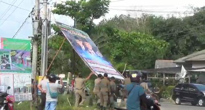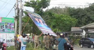 kemudian dilakukan penurunan baliho yang sebelumnya sudah terpasang di beberapa titik wilayah di Kota Pangkalpinang. ( Pwt ).